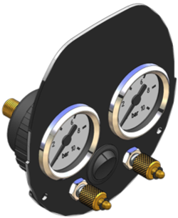 Modellanpassad påfyllningspanel med manometrar och 2 x 10m slang samt monteringsdetaljer.